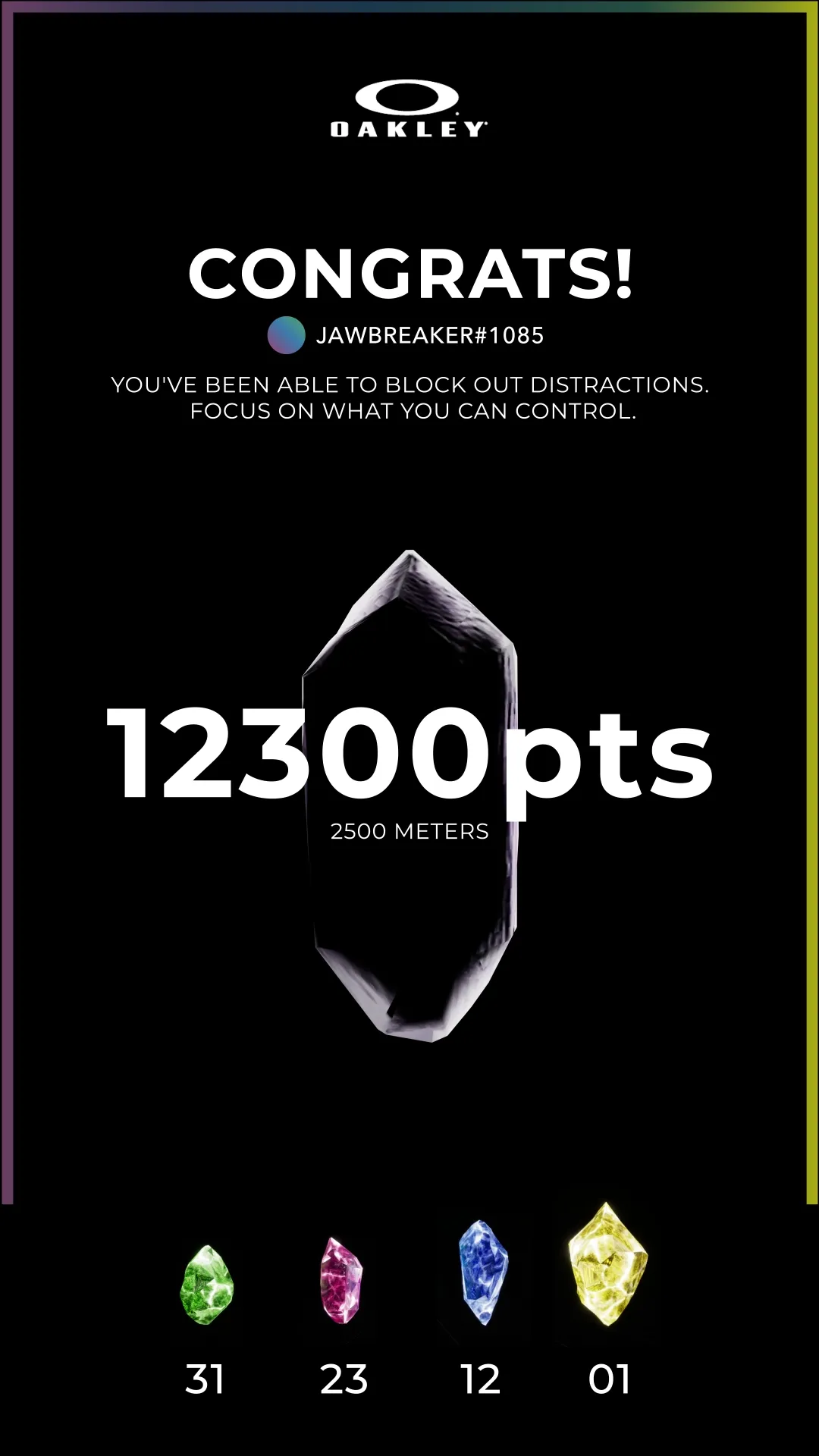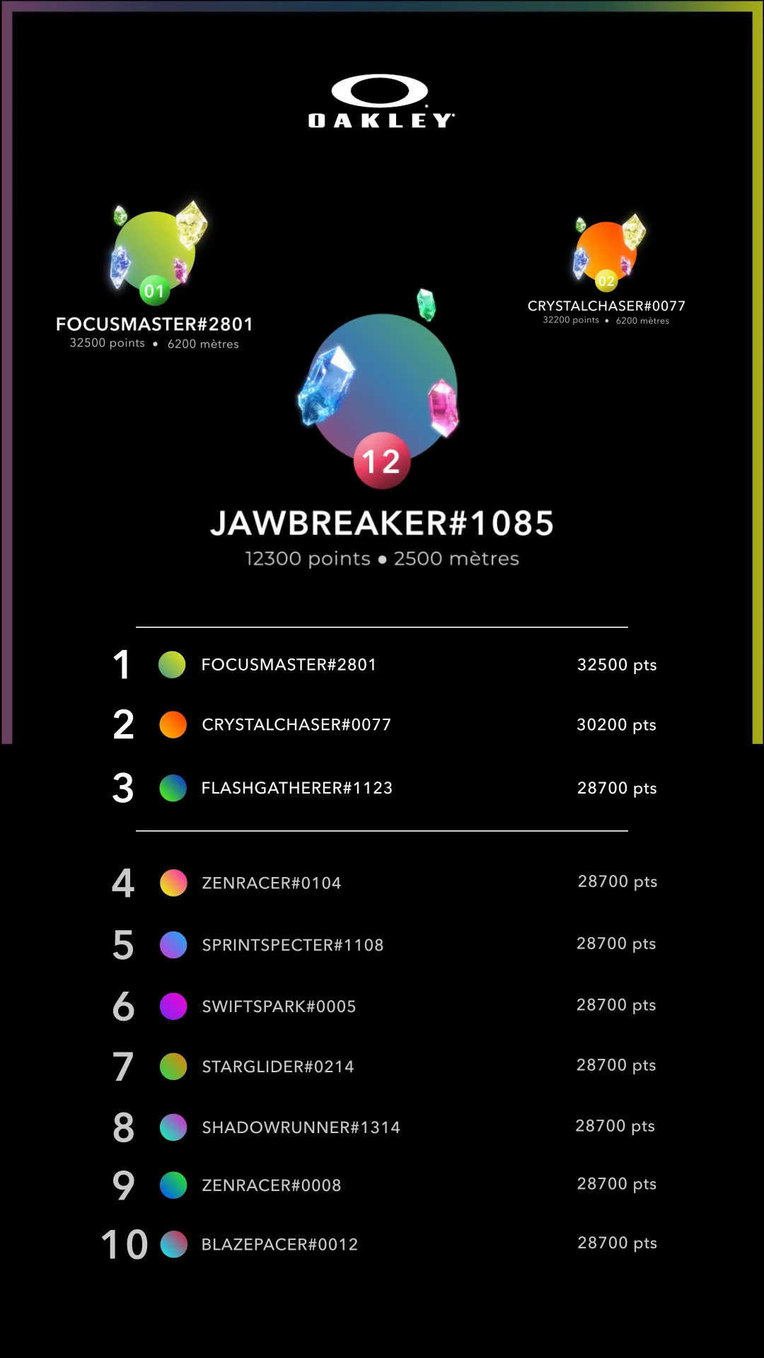 A dynamic time bar with Prizm gradients (in the colours of Oakley lenses) shows you how much time is left: you have 40 seconds to complete the level and reach the exit. Hitting an obstacle doesn’t end your race but slows you down, compromising your goal of reaching the end of the course in the allotted time. There are three types of diamond, each earning different points, as well as a golden diamond offering a bonus of 10,000 points to reward the most concentrated players.